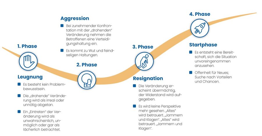 Unter Trauerarbeit verstehen wir die Begleitung dieser Phasen. In jeder Phase des Change Prozesses gilt es, adäquat auf den jeweiligen Gefühlszustand zu reagieren.