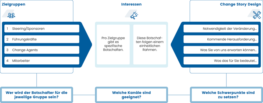 Ein wesentliches Element ist die Change Story, die nicht nur schlüssig erklärt, was sich ändern muss, sondern sogar die Sehnsucht nach dem neuen Ziel wecken kann. Diese Geschichte ist die Grundlage der One-Voice-Policy. Sie liefert den roten Faden für alle, die über den Veränderungsprozess sprechen. Nur so stellst du klare, einheitliche Botschaften sicher.