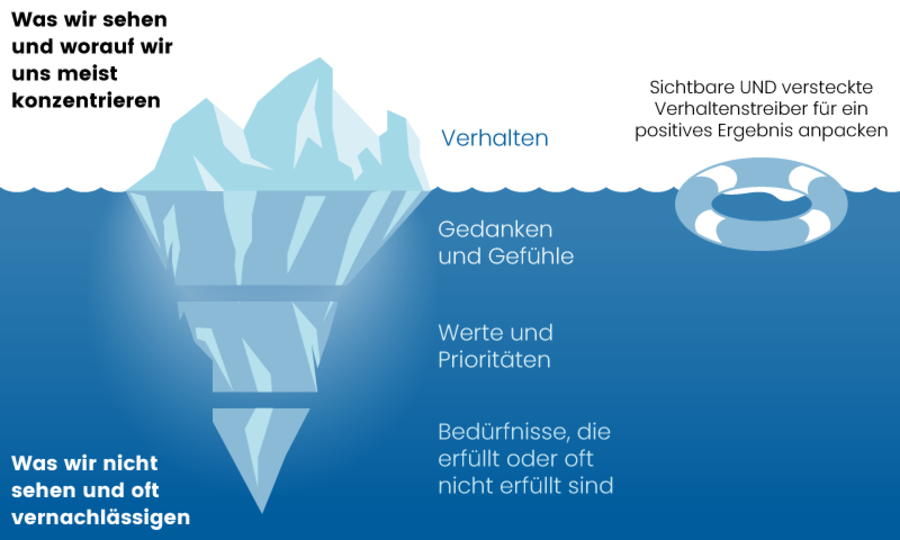 Nachhaltiger Wandel ist nur möglich, wenn man den Eisberg an seinem Bauch packt: Der Wandel muss mit positiven Gefühlen behaftet sein, es müssen bewusst neue, angestrebte Werte verankert werden, und man muss die Grundbedürfnisse des Menschen immer im Auge haben.
