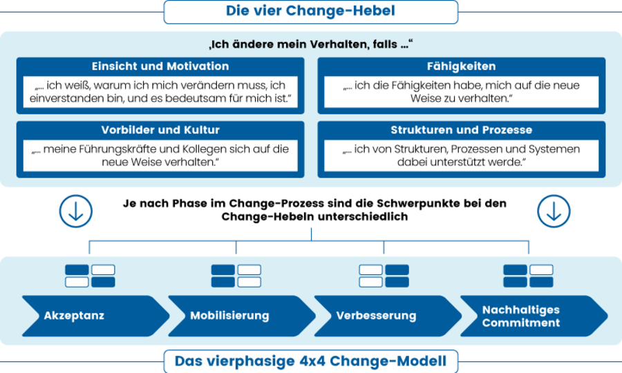 Um vor dem unübersichtlichen Hintergrund vieler Change-Projekte ein strukturiertes, zielstrebiges und effizientes Vorgehen zu ermöglichen, haben wir das 4x4 Modell entwickelt. Es beschreibt die vier Hebel, um individuelle und organisationale Verhaltensveränderung zu begleiten und gibt mit vier Veränderungsphasen Orientierung und einen roten Faden für den Change-Prozess: