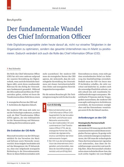Die Funktion des CIO in den Unternehmen hat sich im Gefolge des technologischen Fortschritts und der Veränderungen, die sich im Unternehmensumfeld vollziehen, gewandelt. Aus dem traditionellen CIO wird zunehmend ein Chief Transformation Officer (CTO), der als strategischer Partner des CEO, Architekt der digitalen Infrastruktur und Wächter der Unternehmenswerte fungiert.