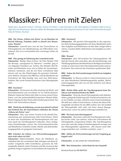 Neben dem „Situativen Führen" zählt das „Führen mit Zielen" zu den Klassikern in der Führungslehre. Trotzdem erlebt es seit einiger Zeit eine Renaissance. Warum, erklärt der Managementberater Hans-Jörg Schumacher von der Unternehmensberatung Dr. Kraus & Partner, Bruchsal.